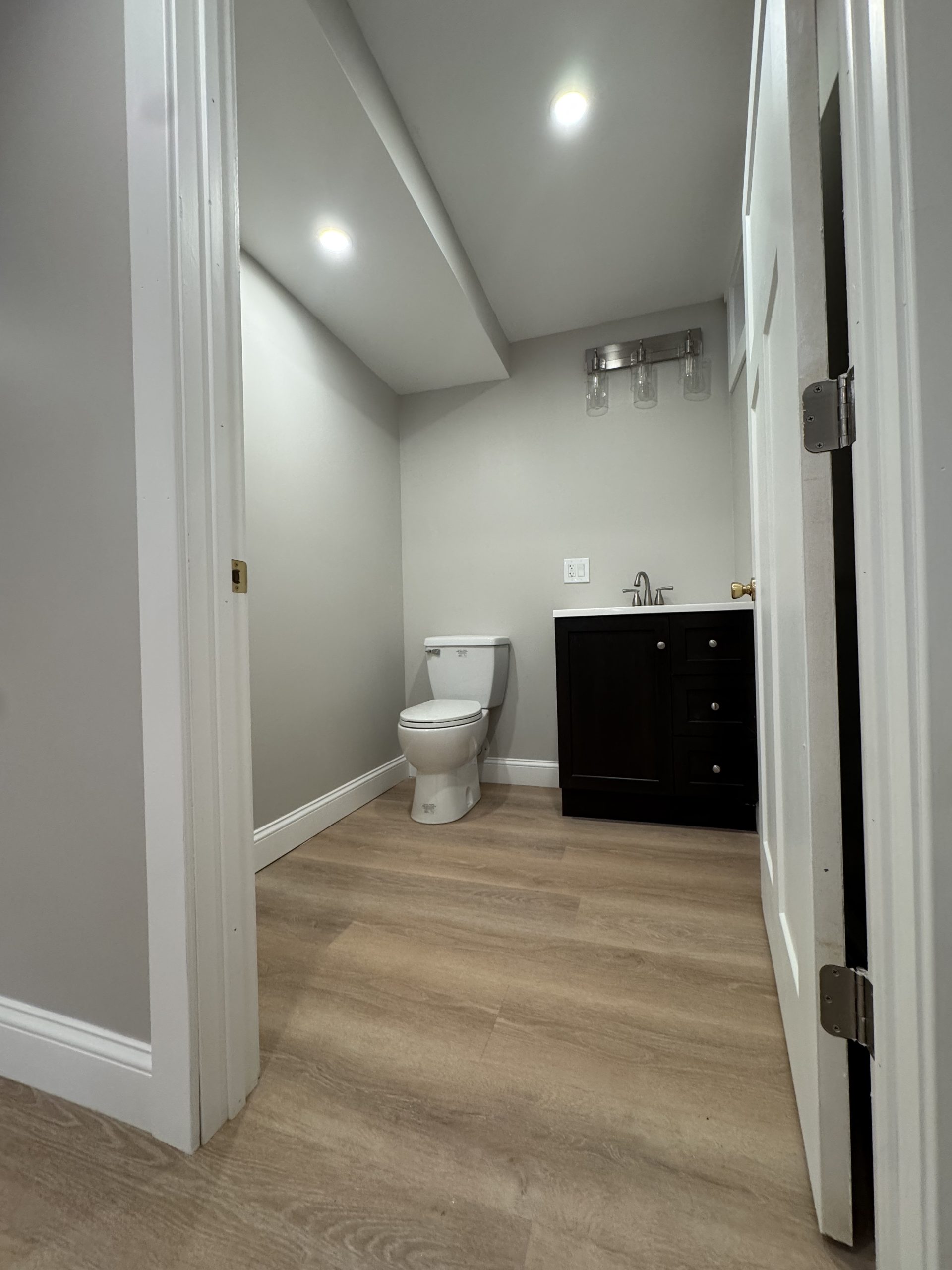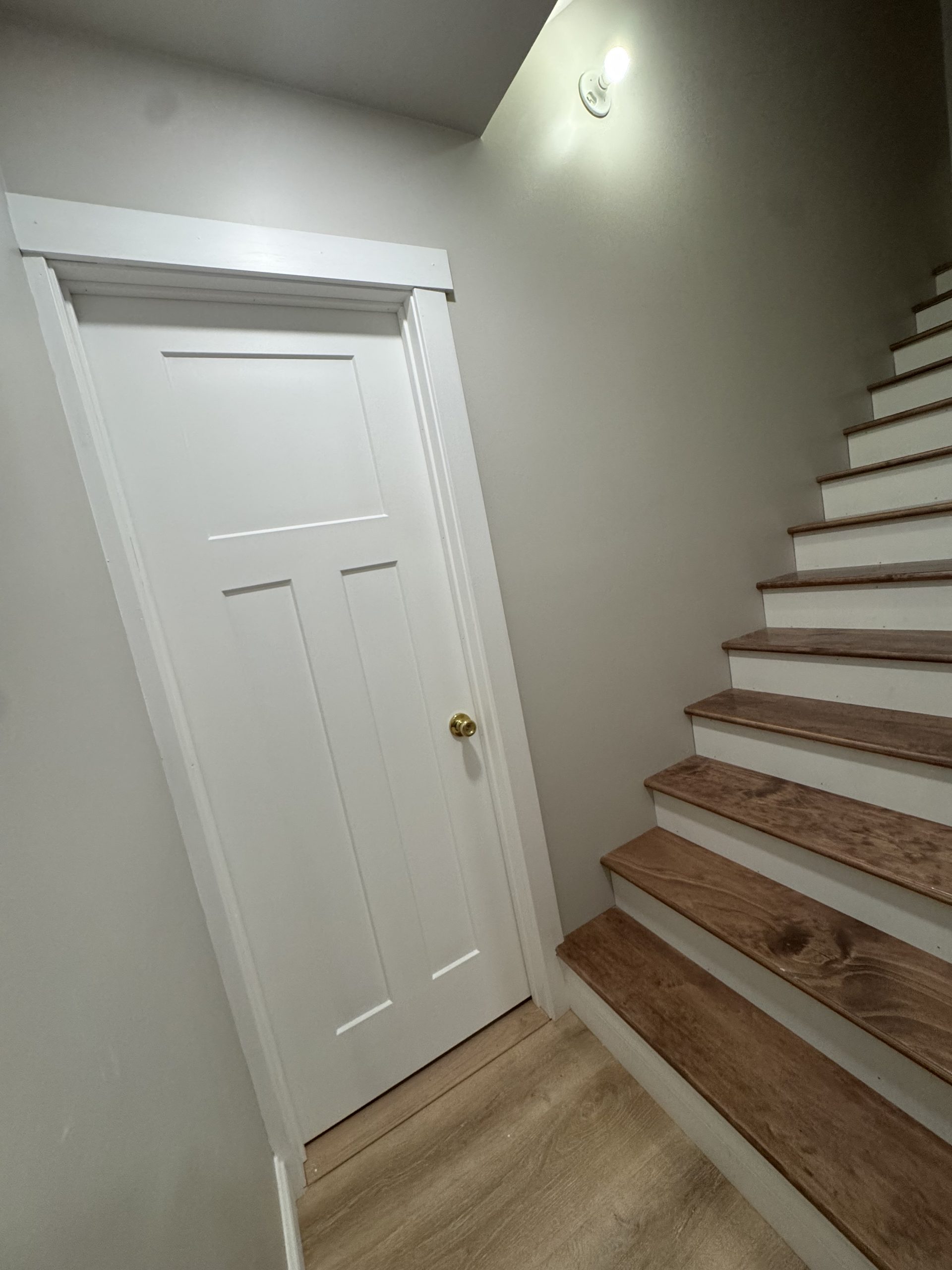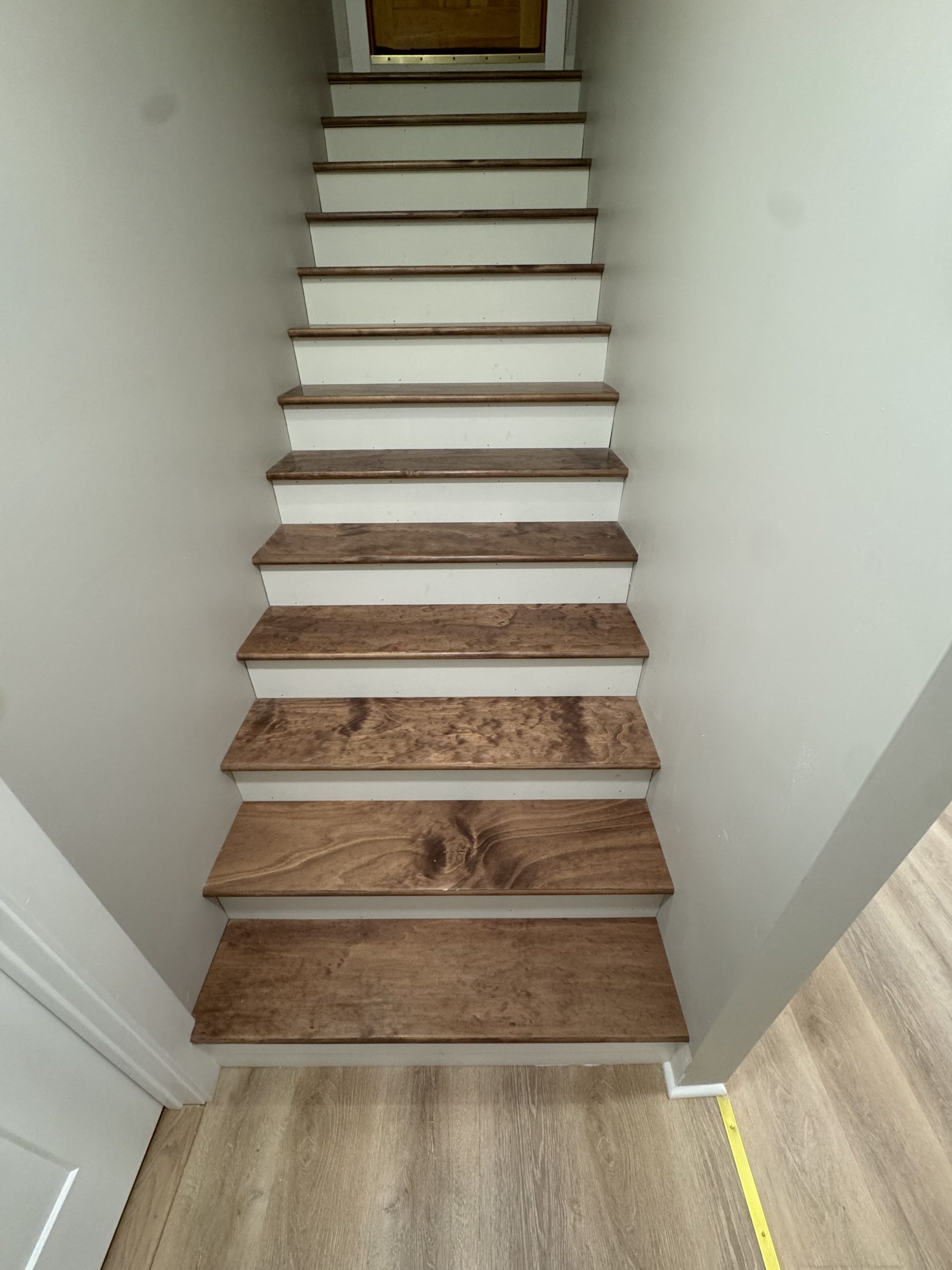 This basement renovation in Bethel, Maine, transformed an underused space into a modern, comfortable, and functional living area. The $50,000 project included new LVP flooring, custom oak stair treads, and the addition of a new half bathroom, blending practicality with timeless design.