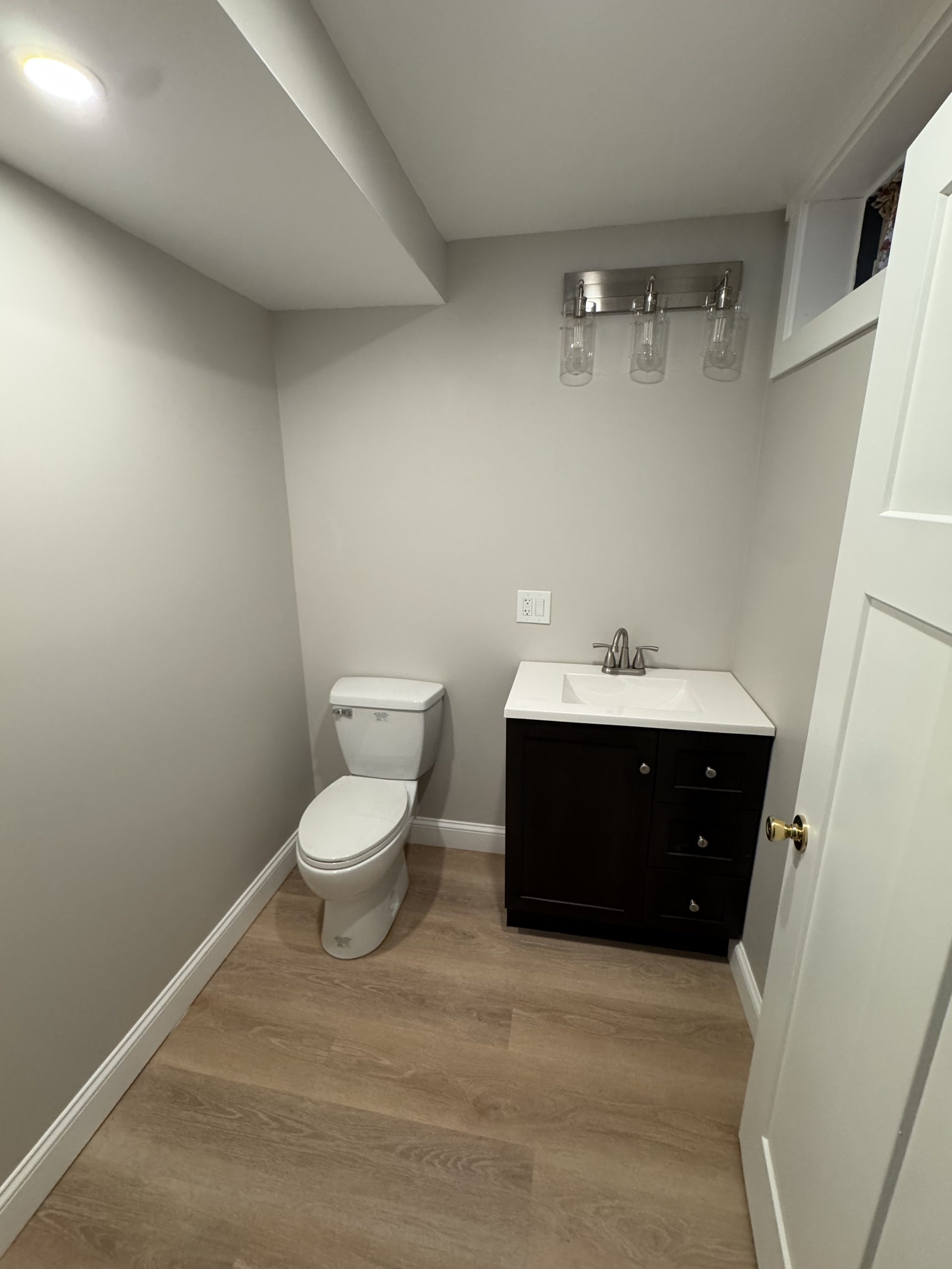 The addition of a half bath makes the basement more convenient for guests and family gatherings. Space-saving fixtures and modern finishes keep the design cohesive with the rest of the home.